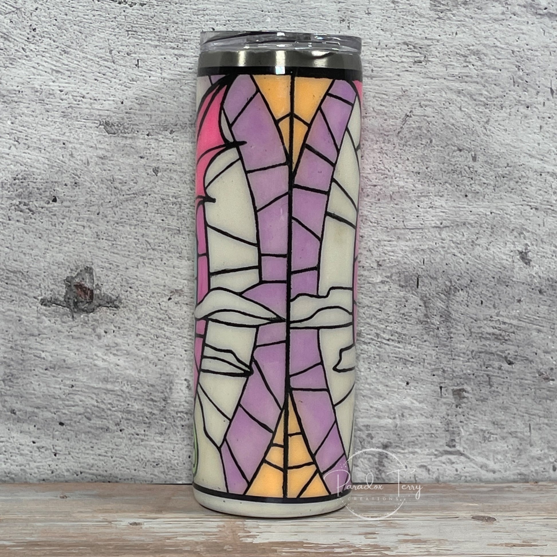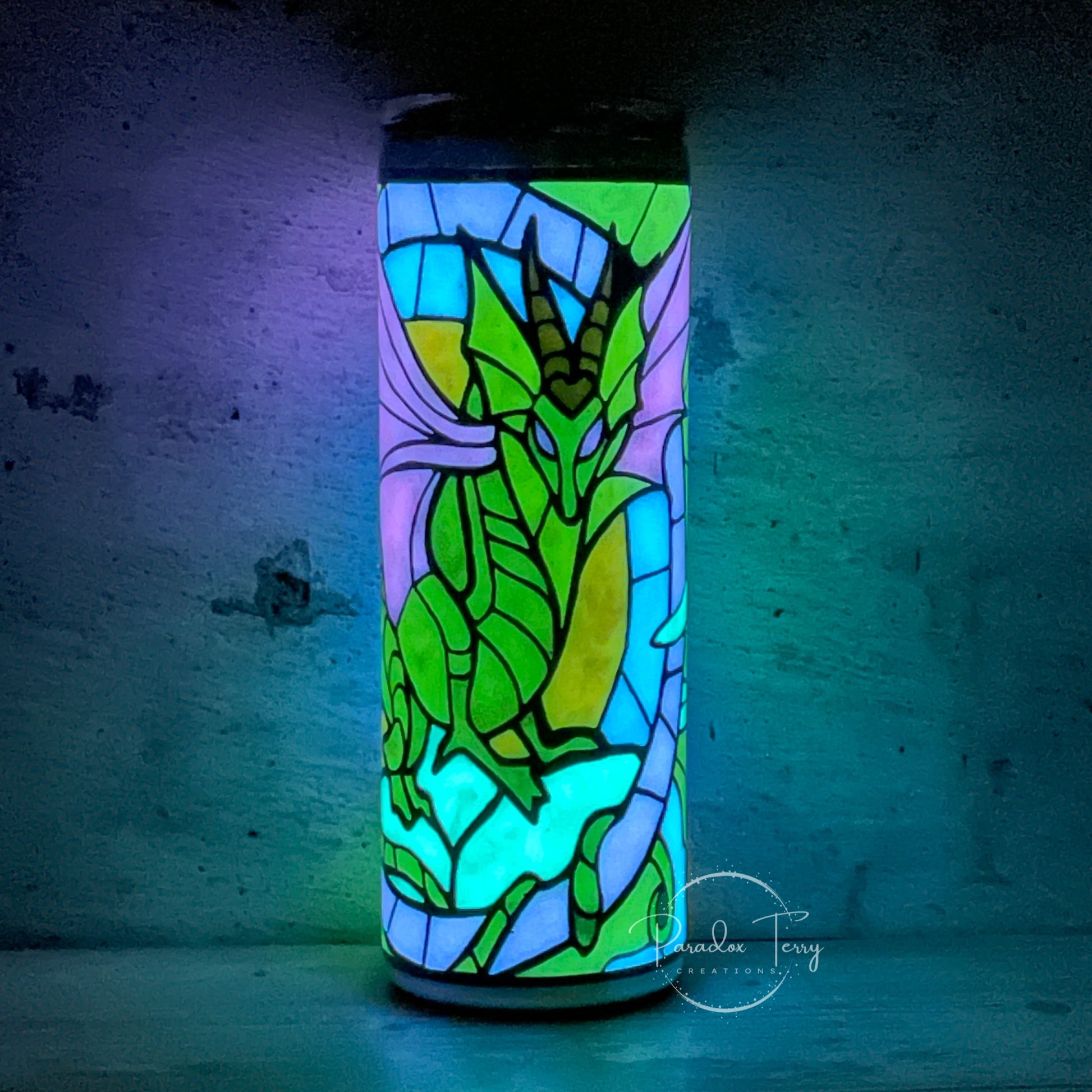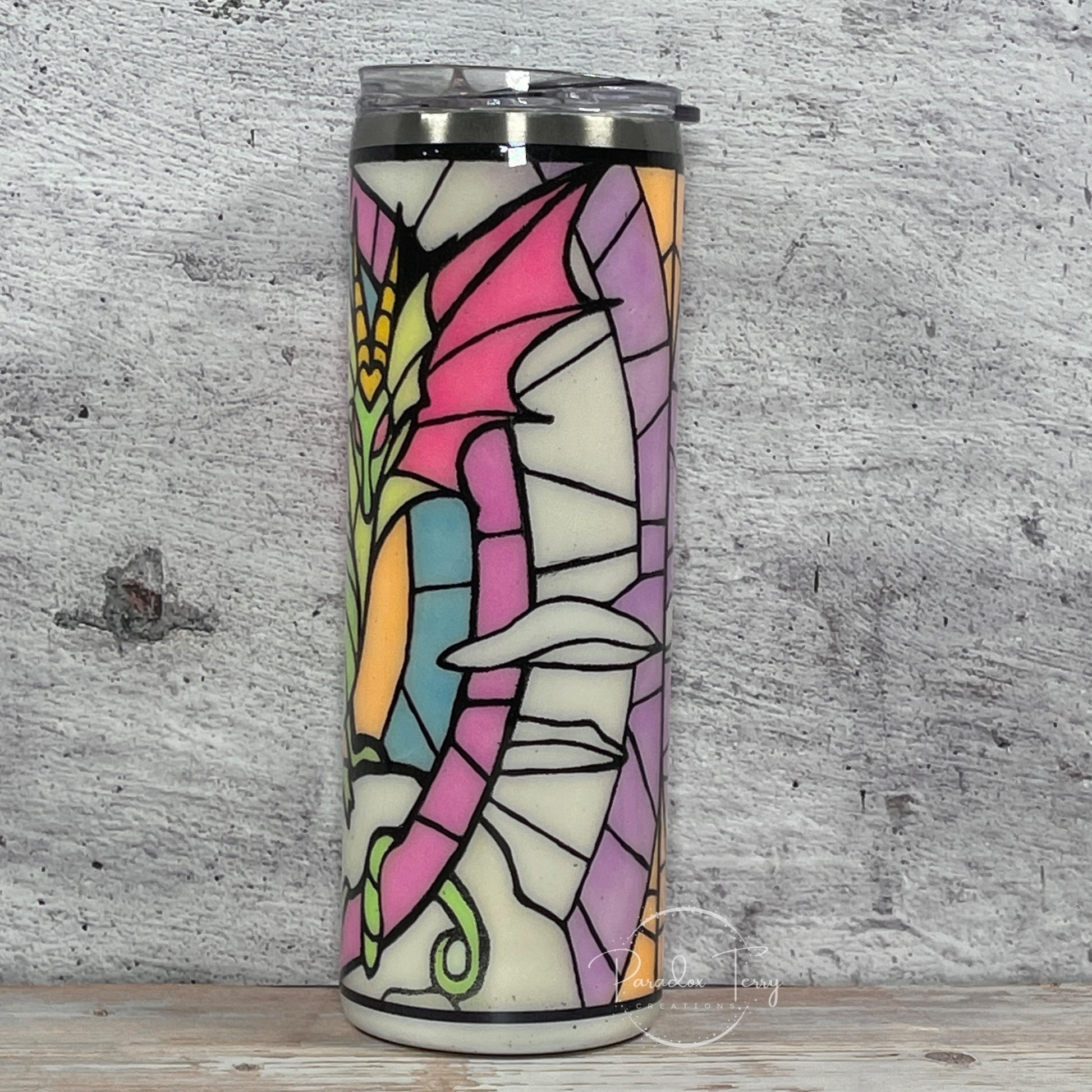 This 20 ounce dragon tumbler has a fun surprise…it glows in the dark after a few minutes of exposure to UV rays (sunlight or UV lights).