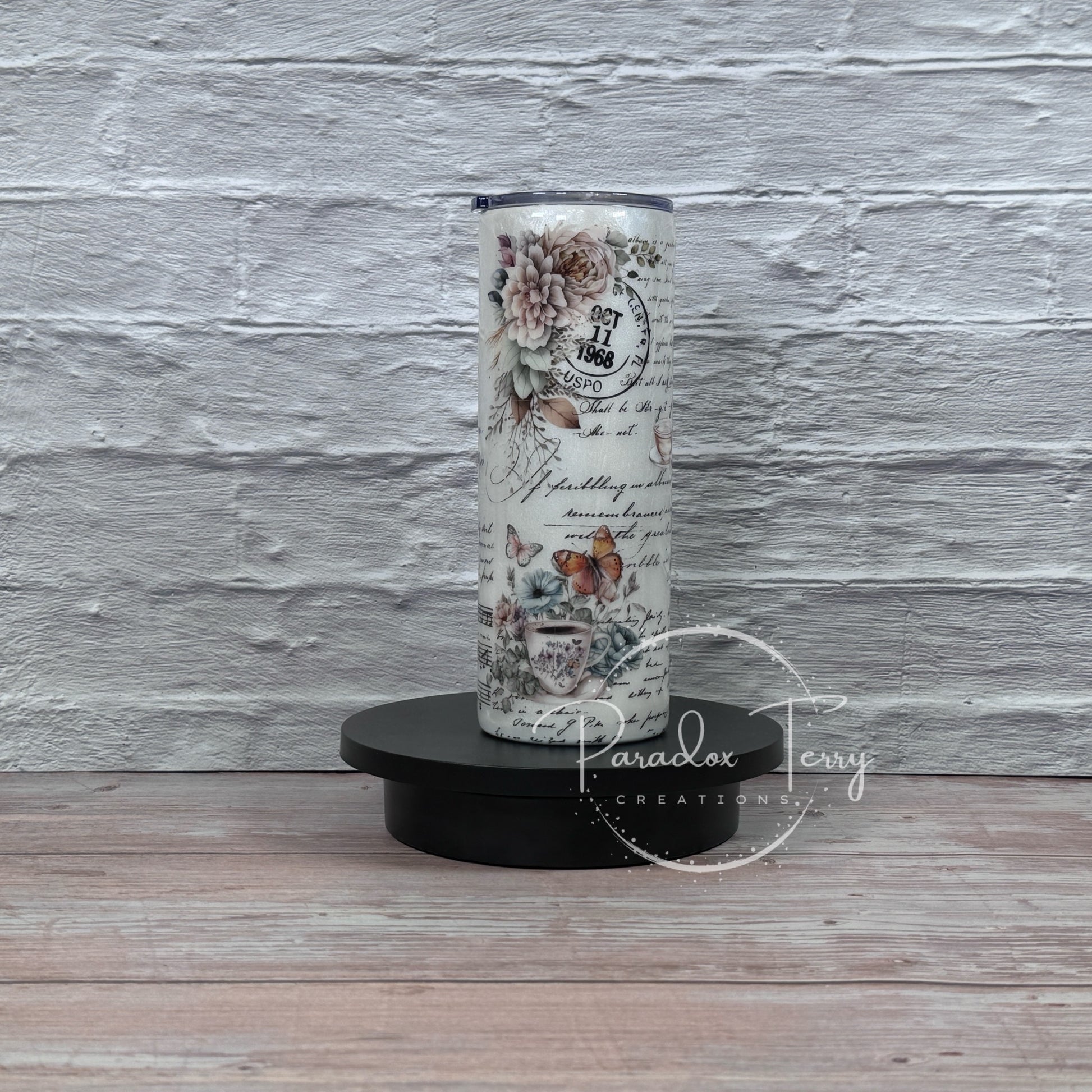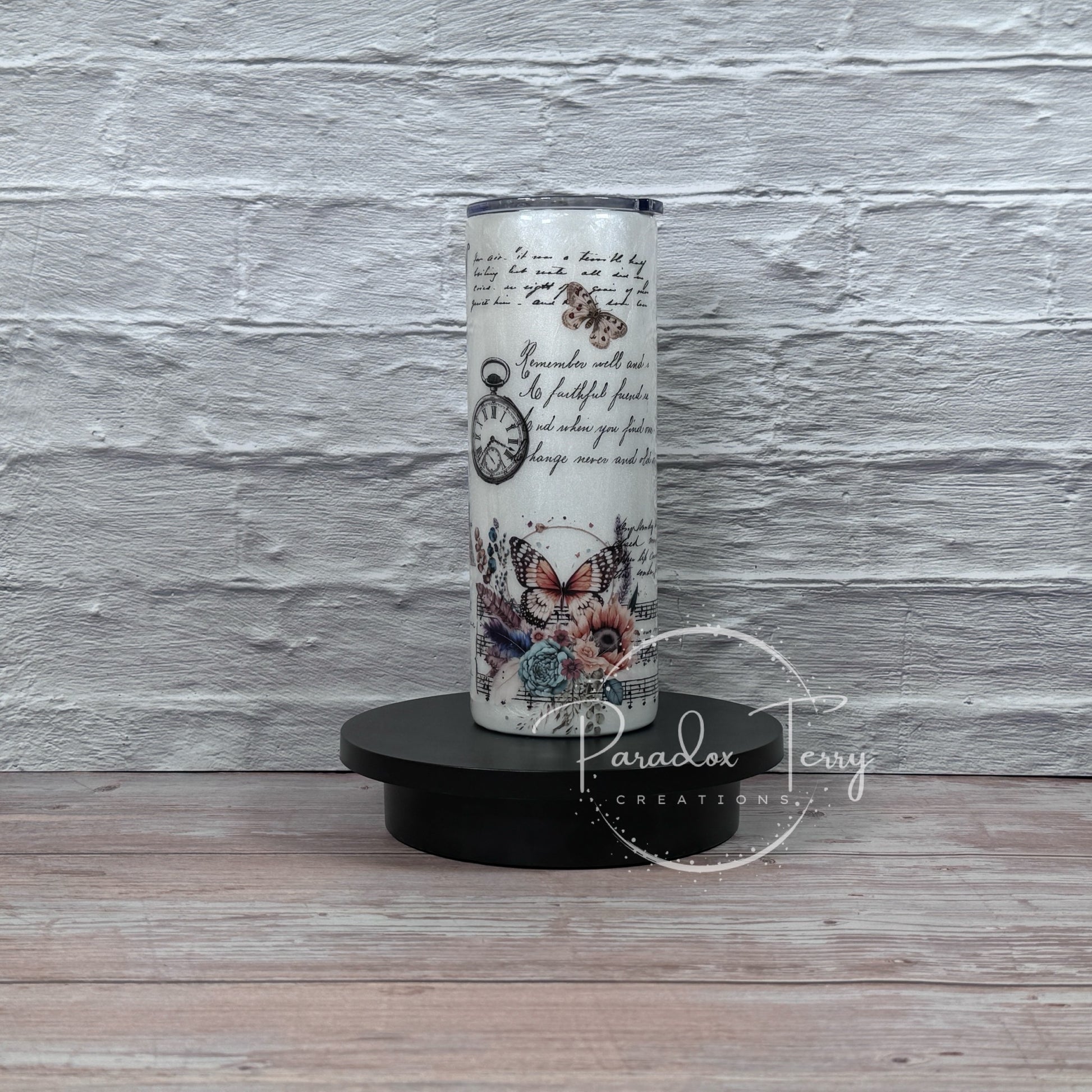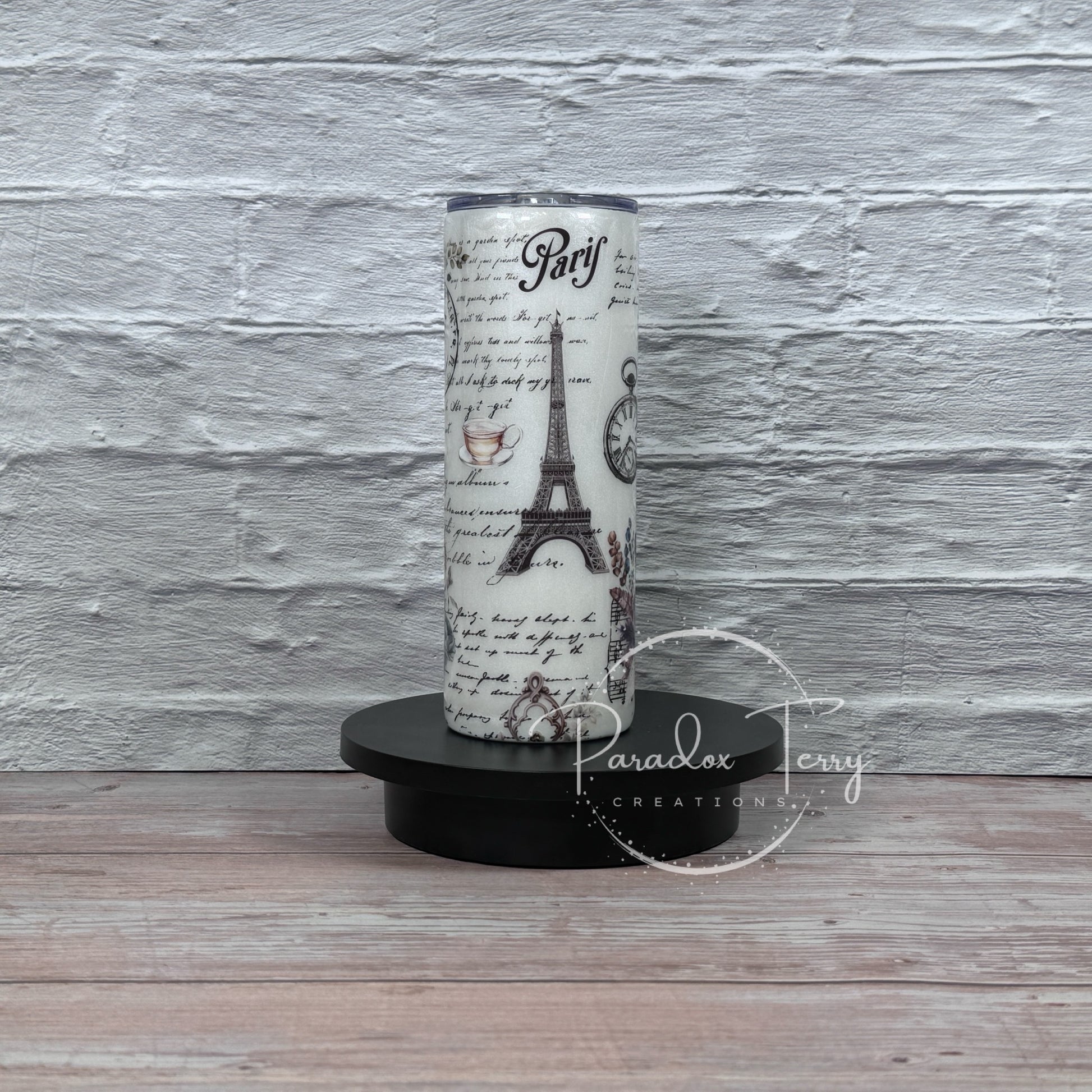 This elegant 20 oz. tumbler is adorned with the Eiffel Tower, butterflies, flowers and much more.