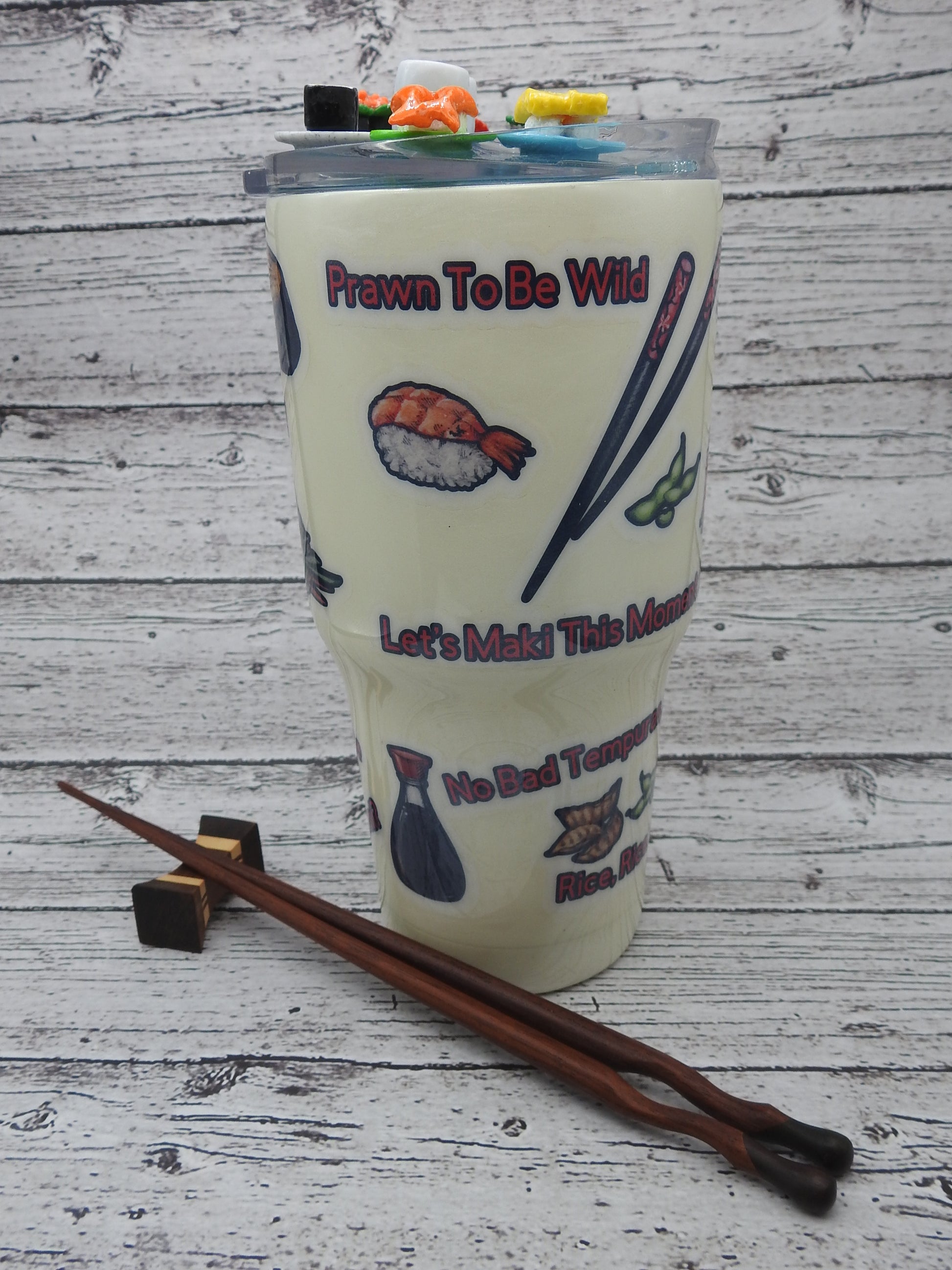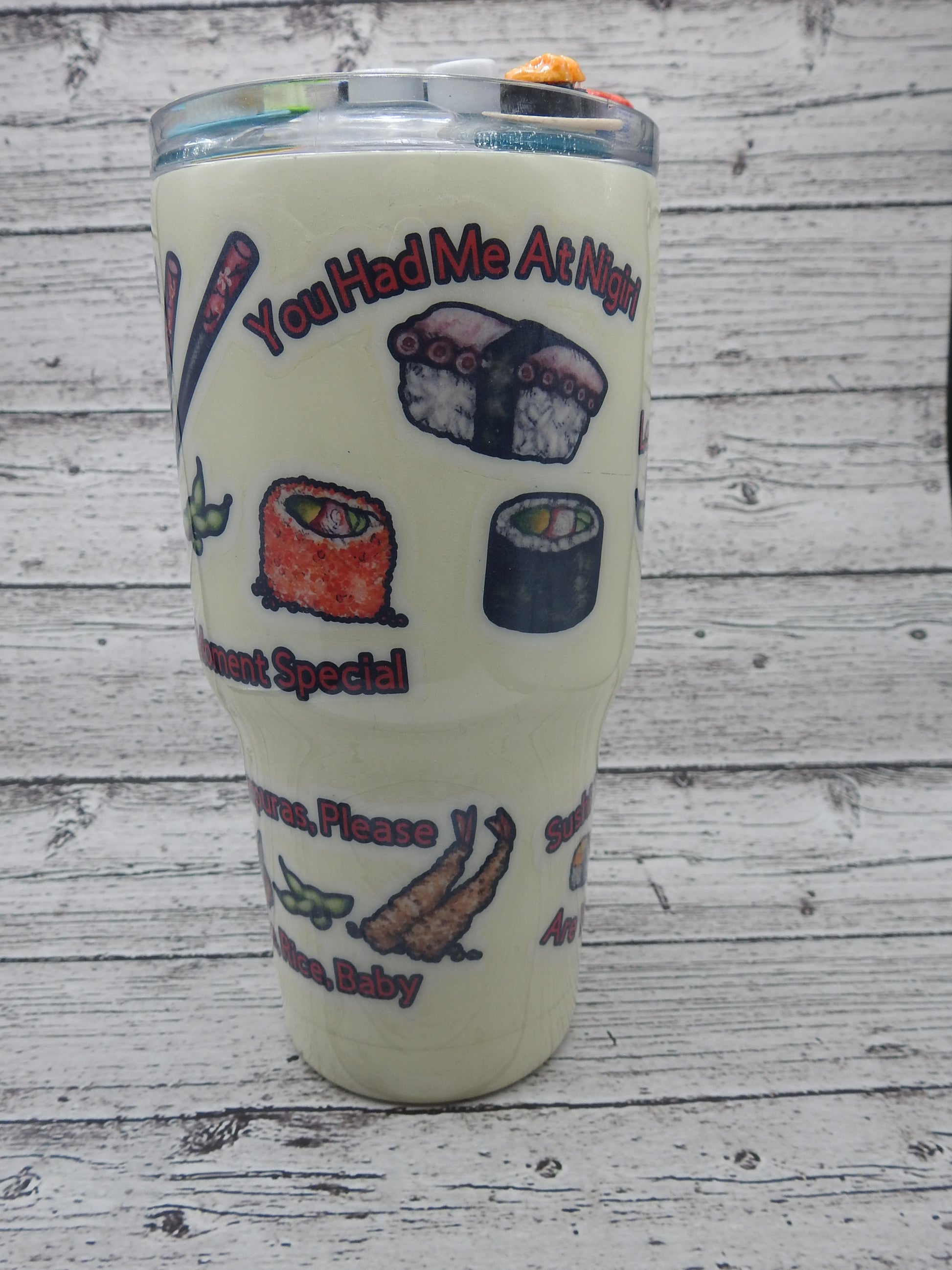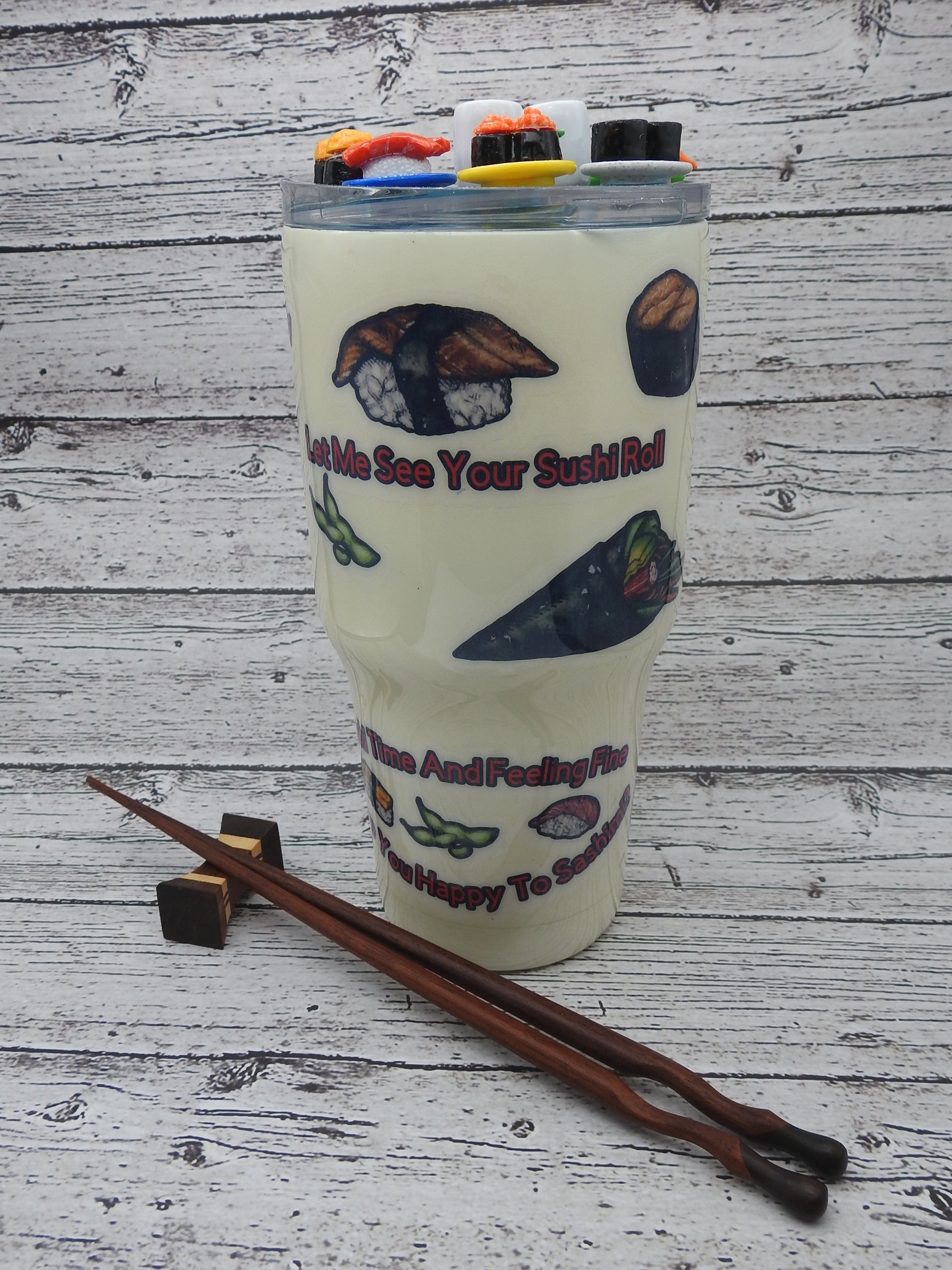This 32 ounce vacuum insulated tumbler has lots of whimsical sushi sayings.  And, the fun topper adds that much more fun to this tumbler.